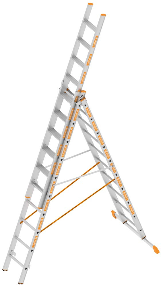Dreiteilige Aluminium-Allzweckleiter â Mit Stufen â Wahlweise als Schiebeleiter, Anlegeleiter, Stehleiter oder verlĂ€ngerbare Stehleiter einsetzbar â Sicherer freistehender Stand der Leiter durch Traverse â Aluminiumaussteifer verhindern ein versehentliches Lösen, können aber per Knopfdruck einfach entriegelt werden â Sprossenweise manuelle Höhenverstellung durch Aufsetzhaken â Sicherung gegen Ausheben und Ausschieben â Sicherungsklappen verhindern beim Tragen ein seitliches Verschieben der Leiternteile â Oberleiter mit verschweiĂten Stufen â Mit rutschhemmenden Eigenschaften des Stufenprofils (entspricht der Bewertungsgruppe R12) â 80 mm tiefe Stufen entsprechend den TRBS 2121-2 Richtlinien