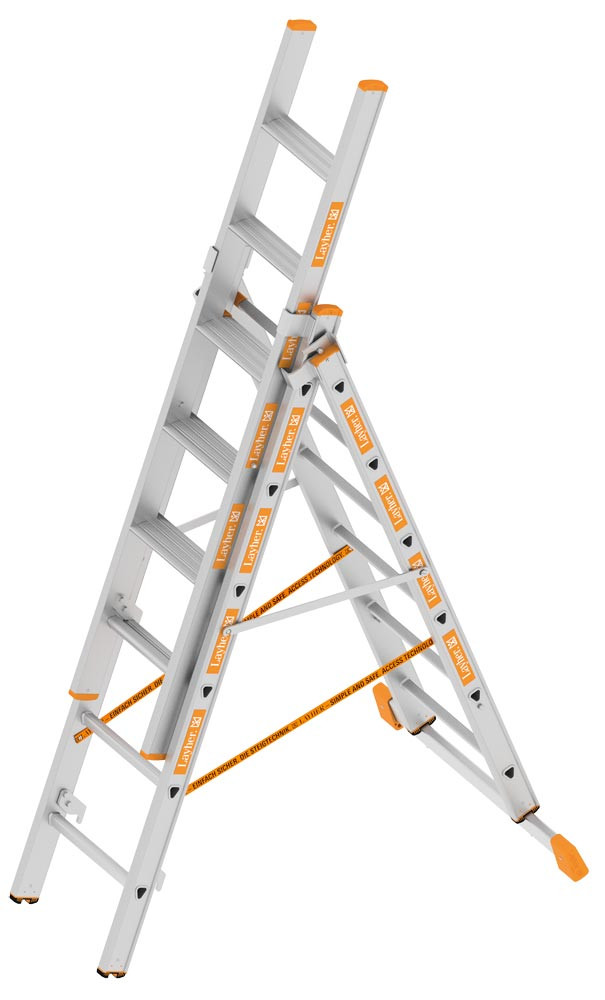 Dreiteilige Aluminium-Allzweckleiter â Mit Stufen â Wahlweise als Schiebeleiter, Anlegeleiter, Stehleiter oder verlĂ€ngerbare Stehleiter einsetzbar â Sicherer freistehender Stand der Leiter durch Traverse â Aluminiumaussteifer verhindern ein versehentliches Lösen, können aber per Knopfdruck einfach entriegelt werden â Sprossenweise manuelle Höhenverstellung durch Aufsetzhaken â Sicherung gegen Ausheben und Ausschieben â Sicherungsklappen verhindern beim Tragen ein seitliches Verschieben der Leiternteile â Oberleiter mit verschweiĂten Stufen â Mit rutschhemmenden Eigenschaften des Stufenprofils (entspricht der Bewertungsgruppe R12) â 80 mm tiefe Stufen entsprechend den TRBS 2121-2 Richtlinien