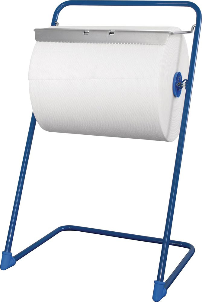 für Industrierollen · Standgerät aus blau lackiertem Metall mit Abrissschiene · geeignet für Rollen mit max. 400 mm Breite und bis zu 500 mm Ø