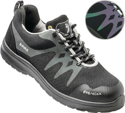 nach EN 20345:2011 · S1P SRC ESD · Obermaterial: atmungsaktives Textilmaterial mit reflektierender PU-Applikation · abriebfester PU-Film im Spitzenbereich als Anstoßschutz · weich gepolsterter Schaftabschluss · klimaregulierendes Textilfutter · weich dämpfende Baak ESD Softstep-Einlegesohle · Stahl-Flexkappe mit Verlängerung an der Außenseite · nichtmetallische, durchtrittsichere, flexible Brandsohle · PU-Laufsohle: sehr flexibel, rutschhemmend, nicht kreidend · Baak go&relax System: bestehend aus Flexzone, Flexkappe und H-Gelenk für ein fußgerechtes Abknicken · nach DGUV 112-191 · Weite 10 · Anwendung: Bereiche, in denen Einwirkung von Feuchtigkeit nicht zu erwarten ist: Handwerk, Automobilindustrie, Elektroindustrie, Druckindustrie, Energie- und Versorgungsindustrie, Verpackungsindustrie, Logistikbereich, Flugzeugbau Weitere technische Eigenschaften: · Zehenschutzkappe: Stahl · Zwischensohle: metallfrei · Ausführung: DGUV 112-191 · Norm: EN ISO 20345