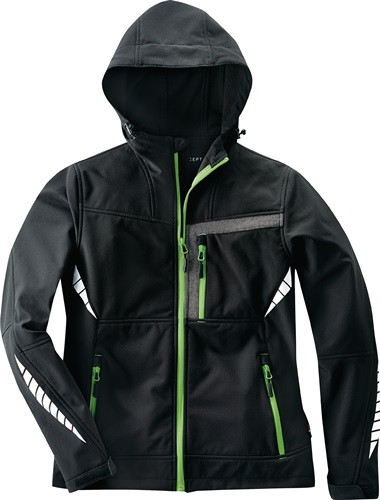 Material 94 % Polyester, 6 % Elastan · moderne Damen-Softshelljacke mit Fleece-Innenseite · maximaler Tragekomfort durch Elasthan · optimal taillierte Passform · wasserabweisend, atmungsaktiv (800 mvp), winddicht · Reflexapplikationen · Bund- und Ärmelbündchen regulierbar · verlängerter Rücken · Kinnschutz, Windschutzleiste · Innentasche mit Kopfhörer-Kabelführung · 2 Seitentaschen, Brusttasche, Handytasche