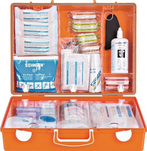 mobil und stationär einsetzbar speziell für Hoch- und Tiefbau, Straßenbau- und Unterhaltungsbetriebe, Abriss- und Sanierungsbetriebe, Landschafts- und Gartenbau · schlagfeste Kofferschale aus ABS-Kunststoff · inkl. Wandhalterung mit 90°-Stopp-Arretierung · Kofferfarbe: orange Zusatzinhalt: u.a. erhöhter aluderm®-aluplast-Pflasteranteil, aluderm®-Verbandstoffe, oculav NIT®-Augenspülung, Splitterpinzette, SÖHNGEN®-Kühlspray, Wundreinigungsset Weitere technische Eigenschaften: · Material: ABS-Kunststoff · prüfpflichtig: ja