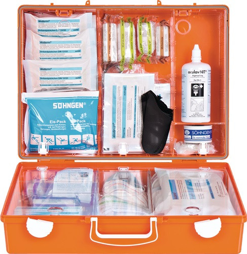 mobil und stationär einsetzbar speziell für Instandsetzungs- und Reparaturbetriebe und technische Werkstätten · schlagfeste Kofferschale aus ABS-Kunststoff · inkl. Wandhalterung mit 90°-Stopp-Arretierung · Kofferfarbe: orange Zusatzinhalt: u. a. oculav NIT®-Augenspülung, Hand- und Wundreinigungsset, WS-Universalbinden, erhöhter aluderm®-aluplast-Pflasteranteil, aluderm®-Spezialverbandstoffe, Splitterpinzette Weitere technische Eigenschaften: · Material: ABS-Kunststoff · prüfpflichtig: ja