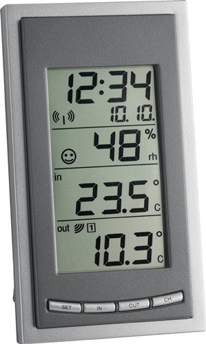 mit 2-Kanal-Sender für kabellose Übertragung der Außentemperatur (max. 100 m) · Anzeige der Innentemperatur und Innenluftfeuchtigkeit · Max./ Min.-Funktion · Funkuhr, Datum · Messbereich außen: -40 °C bis +60 °C · Messbereich innen: -10 °C bis +60 °C · umschaltbar °C/°F · Luftfeuchtigkeit 1 % bis 99 % · Zeitzone ± 12 Std. · zum Hängen oder Stellen · inkl. 1 Temperatur-Außensender · Außensender: H 128 x B 41 x T 23 mm Weitere technische Eigenschaften: · Gewicht: 165g · Ausstattung: umstellbar Grad °C/Grad °F · geeignet für: innen und außen · Material: Kunststoff