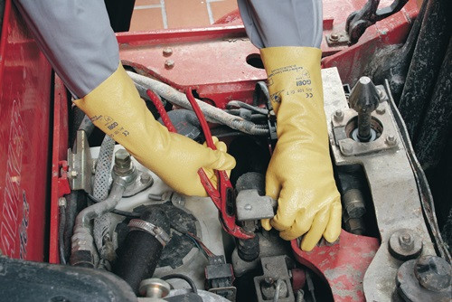 nach EN 388 · Kat. II · Material: BW-Trikot mit Nitril · beschichtet mit Spezialnitril · gute Temperaturbeständigkeit · feuchtigkeitsabweisend · Lebensmittelunbedenklichkeit gem. EU 1935/2004 · gute mechanische Beständigkeit · gute Griffigkeit bei nassen Teilen · zusätzlicher Unterarmschutz durch verlängerte Stulpe · weite Stulpe für schnelles An- und Ausziehen · Anwendung: Automobilindustrie, Maschinenbau, Transportarbeiten, Feinmechanik, Verpackungsindustrie, Bauindustrie, Arbeiten mit nassen und öligen Teilen Weitere technische Eigenschaften: · Abriebfestigkeit: 3 · Weiterreißfestigkeit: 1 · Stichfestigkeit: 1 · Schnittfestigkeit (Schneidetest): 1 · Ausführung: Lebensmittelunbedenklichkeit · Norm: EN 388