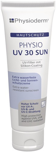 extra wasserfeste Hautschutzcreme gegen natürliche und künstliche UV-Strahlung mit ausgewogenem Lichtschutzfaktor 30 / UV-A 24 · der hohe Schutz wird durch optimierte UV-Filter mit Silikon-Coating erzielt · bietet zudem Schutz vor UV-C-Strahlung · Anwendung an Arbeitsplätzen mit intensiver natürlicher UV-Strahlung, z. B. bei Außenarbeiten und beim Umgang mit künstlichen UV-Strahlungsquellen, z. B. beim Elektroschweißen · die Wasserfestigkeit von PHYSIO UV 30 SUN erhält den Lichtschutz auch bei starkem Schwitzen oder Arbeiten im wässrigem Umfeld Weitere technische Eigenschaften: · Ausführung: wasserfest · Gebinde: Tube · Reinigungsbereich: gegen UV-Belastung