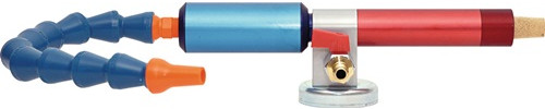 zur punktuellen Kühlung von Metall- und Kunststoffteilen an Werkzeugmaschinen · zur Kühlung mit Kaltluft an Stellen, an denen keine Schmier- oder Kühlflüssigkeiten erwünscht sind · erzeugt sowohl Kalt- als auch Heißluft · Das Zubehör besteht aus dem flexiblen ARIANA-Cool-Line-System (1/2″) sowie aus einer Magnetplatte, Kugelhahn, Gewindetülle für Schnellkupplung sowie einem Schalldämpfer. · Anwendung: Die Kaltluftdüse wird an Druckluft angeschlossen, bzw. mit Druckluft betrieben. Nach der Funktionsweise des Wirbelrohrprinzips rotieren innerhalb der Kaltluftdüse zwei gegenläufige Luftströme. Der Kaltluftaustritt erfolgt am blauen Bauteil, der Heißluftaustritt am roten Bauteil. Einstellung von Volumenstrom und Kaltluftanteil durch Verstellschraube.