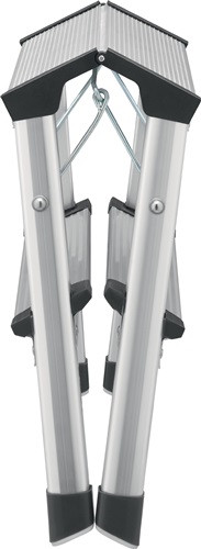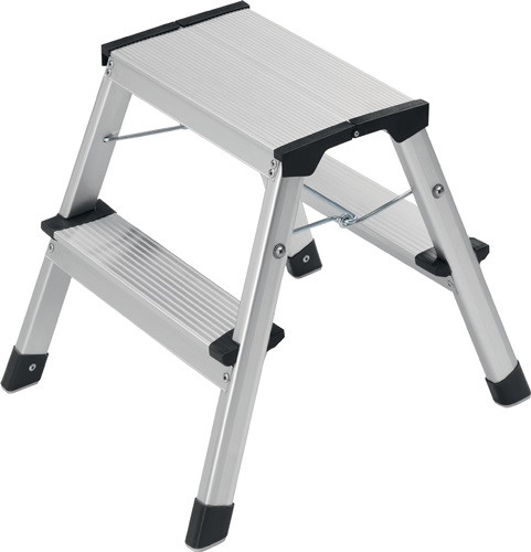 Aluminium · leicht und handlich · platzsparend, zusammenklappbar · Stufen mit Anti-Rutsch-Riffelung · Holme eloxiert · Sicherheitsverriegelung · 2-Komponenten-Kunststofffuß für sicheren Stand auf verschiedenen Böden · max. Gesamtbelastung 150 kg Weitere technische Eigenschaften: · Tiefe geklappt: 190mm · Oberfläche: Holme eloxiert · Höhe geklappt: 470mm · Breite geklappt: 410mm · prüfpflichtig: ja