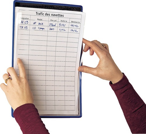 DIN A4 · vielseitig einsetzbar · 2 Klarsichtbänder aus weichem PVC halten das Blatt · Befestigung durch Öse · strapazierfähige, reflexfreie PVC-Folie mit kunststoffummanteltem Stahldraht, blau gerahmt · VE = 5 Stück