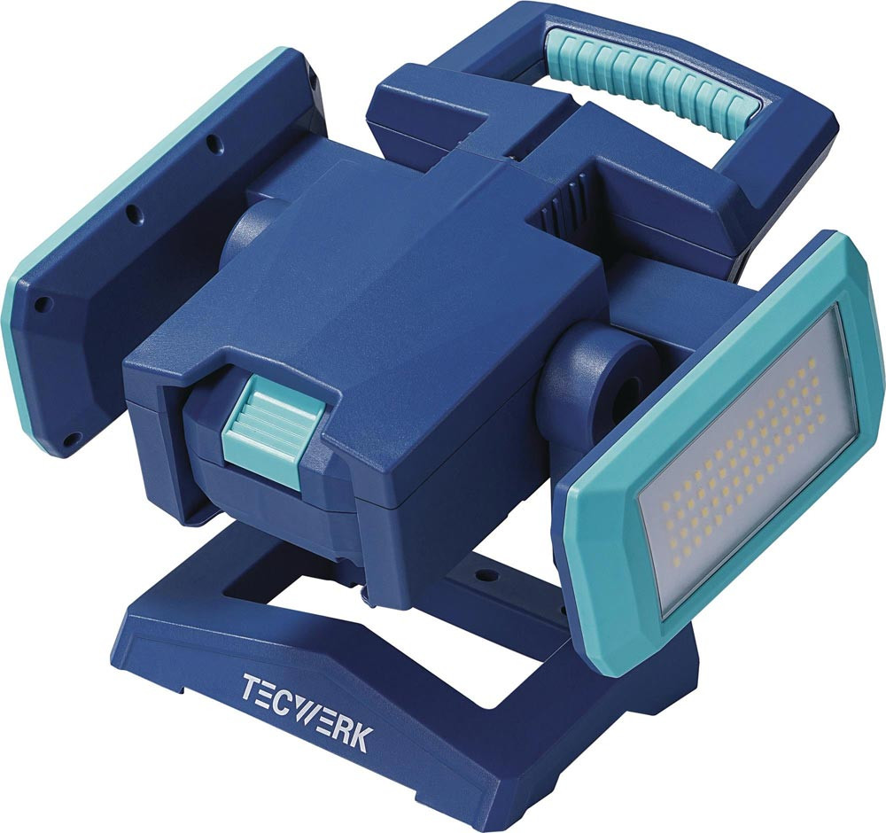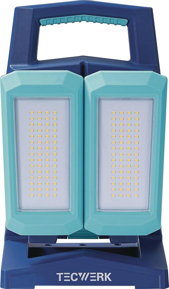 120 leistungsstarke SMD LEDs · einstellbarer Beleuchtungswinkel, vertikal 90 Grad und horizontal 180 Grad · mit Ladestandsanzeige · robustes Gehäuse und praktischer Handgriff ermöglichen universellen Einsatz · inklusive Powerbankfunktion