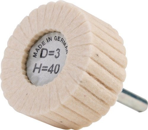 bestehend aus weichen Filzlamellen · für den Einsatz mit herkömmlicher Polierpaste zum Vorpolieren bis hin zum Hochglanzpolieren · geeignet für Stahl, Edelstahl (INOX), NE-Metallen, Glas, Kunststoff, Marmor und Stein · für schwer zugängliche Stellen und präzises Arbeiten · stets dieselbe Polierpaste mit einer Polierscheibe auf demselben Material einsetzen · für ein optimales Ergebnis, sollte mit einer Geschwindigkeit von 10m/s gearbeitet werden · Schaft-Ø 6 mm D = Lamellendicke H = Filzhärte Weitere technische Eigenschaften: · Ausführung: medium D5/H40 · max. Drehzahl: 6000min-¹