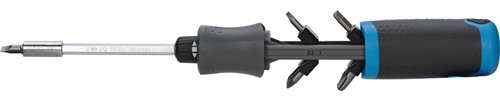 kompakter Bit-Schraubendreher mit Knarrenfunktion und integriertem Magazin · magnetische Bitaufnahme · geeignet für Bits 6,3 mm (1/4″) C 6,3 Rückschwenkwinkel, fast 0˚ (mit mechanischen Messmitteln nicht messbar) · Rechts-/Linkslaufverstellung durch Drehring, neutrale Mittelposition mit Ratschensperre (ermöglicht Schrauben ohne Ratschenfunktion) · Inhalt: je 1 Bit für Schlitzschrauben Gr. 5,5 / 6,5 mm je 1 Bit für Schrauben mit Kreuzschlitz (PH) Gr. 1 - 2 - 3 je 1 Bit für Schrauben mit Kreuzschlitz (PZD) Gr. 1 - 2 je 1 Bit für Schrauben mit Innen-TORX®-Profil Gr. T 10 / 15 / 20 / 25 Weitere technische Eigenschaften: · Länge: 225mm · geeignet für: Bits 6,3 mm (1/4 ″) DIN ISO 1173-C 6,3