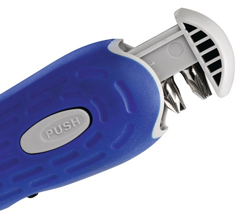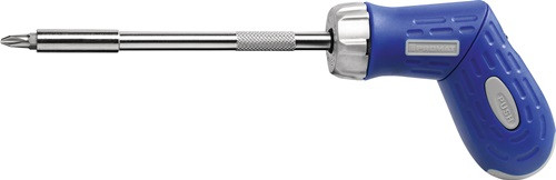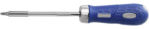 mit integriertem Bitmagazin · umschaltbar rechts/fixiert/links Inhalt: 1 verstellbarer Bithandhalter mit Magnet (30/180° - Pistolen-/Stabform) je 1 Bit für Schlitzschrauben 4 / 5,5 / 6,5 mm* je 1 Bit für Schrauben mit Kreuzschlitz (PH) Gr. 1 / 2* je 1 Bit für Schrauben mit Kreuzschlitz (PZD) Gr. 1 / 2* (* alle Bits ca. 25 mm lang)