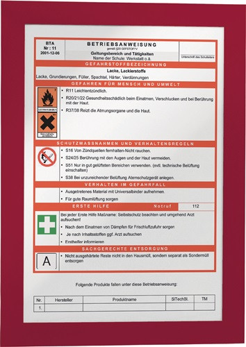 selbstklebend · mit vollflächiger Selbstklebefolie auf der Rückseite, zur Anbringung auf glatten Oberflächen · der Rahmen lässt sich rückstandslos lösen und an anderer Stelle wieder anbringen · Rahmen beidseitig farbig · einfaches und schnelles Austauschen durch aufklappbare, magnetische Vorderseite · auf Glasflächen beidseitig lesbar · VE = 2 Stück · Zur Aufnahme von Brandschutzverordnungen - rot Betriebsanweisungen für Maschinen - dunkelblau oder Betriebsanweisungen gem. GefStoffV - orange