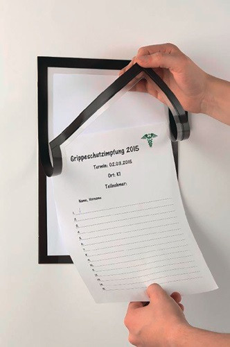 selbstklebend · Format DIN A4 · magnetische Vorderseite für schnelles und bequemes Wechseln von Informationen · direktes Beschriften des Dokumentes · Füllhöhe bis zu 5 Blatt 80g/qm · Stiftehalter für alle Stifte mit Befestigungsclip · haftet dauerhaft auf allen glatten Oberflächen