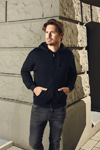 100 % Baumwolle, 320 g/m² · durchgehender und verdeckter Reißverschluss · Doppelkapuze · Kängurutaschen · Elastanbündchen an Ärmeln und Saum · Molton-Brushed Weitere technische Eigenschaften: · Stoffgewicht ca.: 320g/m²