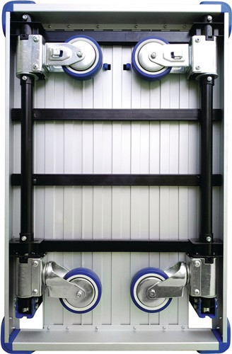robuste Plattform aus Aluminium · Kunststoff-Stoßschutzecken · Dokumententasche am Schiebebügel · gepolsterter Griffbereich · Schiebebügel auszieh- und klappbar · TPR Bereifung, spurlos · 2 Lenk- und 2 Bockrollen · Räder klappen automatisch ein und aus · zusammengeklappt nur 90 mm hoch · Anwendung: Zum Verstauen einfach den Schiebebügel runterklappen und die Räder schwenken automatisch ein Weitere technische Eigenschaften: · Gewicht: 8,5kg · Gestell: Stahlrohr · Ausstattung: Räder und Bügel klappbar · Gesamthöhe: 900mm · Gesamtbreite: 400mm · Ladehöhe: 165mm · Gesamtlänge: 630mm