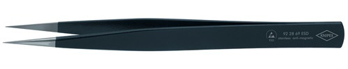 ESD-Beschichtung : blendfrei schwarz, mit einem Oberflächenwiderstand von ca. 105 Ohm · Spitzen blendfrei gebürstet · Greifflächen mattiert für optimalen Halt · Chrom-Nickel-Stahl, rostfrei, antimagnetisch (18/10) Weitere technische Eigenschaften: · Oberfläche: rostfrei, antimagnetisch, elektrisch ableitend · Gewicht: 17g · prüfpflichtig: ja