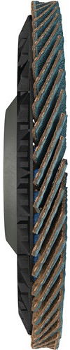 Fächerscheibe mit erhöhter Lamellendichte für eine maximale Standzeit · höchste Abtragsleistung dank Hightech-Zirkon-Lamellen · trimmbarer Kunststoffträgerkörper, der eine vollständige Nutzung der Lamellen garantiert · speziell für den Kanten- und Flächenschliff und zur Bearbeitung von Schweißnähten einsetzbar · Bohrung 22,23 mm Ø Weitere technische Eigenschaften: · Bohrung: 22,23mm · max. Drehzahl: 12250min-¹