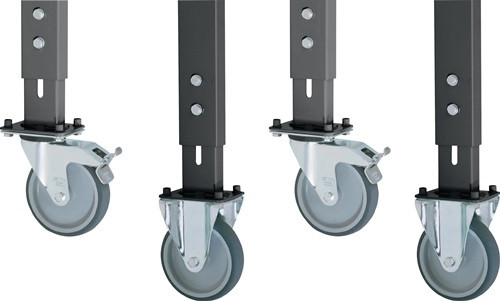 passend für Werktische · bestehend aus 2 Bockrollen und 2 Lenkrollen mit Feststeller · Rollen Ø-125 mm, Bauhöhe 150 mm · stufenlose Einstellung der Arbeitshöhe von 910-1230 mm · Rollen inkl. Höhenverstell-Element