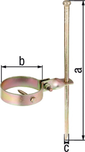 SB-verpackt · ein Set bestehend aus einer Schelle, einem Erdnagel und einer Schlüsselschraube · Material: Stahl roh · Oberfläche: galvanisch gelb verzinkt ·Einzelteile durch Kabelbinder verbunden · Maß a: 400mm · Maß b: 100mm · Maß c: 12mm Weitere technische Eigenschaften: · Oberfläche: galvanisch gelb verzinkt · Maß b Ø: 100mm · Maß a: 400mm · Maß c Ø: 12mm