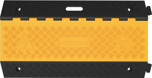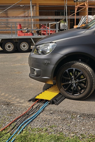 mit drei Kanälen · zum Schutz von Schläuchen oder Kabeln, die nicht dauerhaft verlegt sind · Abmessung Kabelkanäle H 50 x B 68/57/65 mm · keine Befestigung nötig · aus schwarzem vulkanisiertem Vollgummi und rutschhemmende Oberfläche · mit gelben Schutzdeckel und Tragegriff · überfahrbar bis zu einem Achsgewicht von 8 t · Endlosmontage mit Zapfen/Nut-System