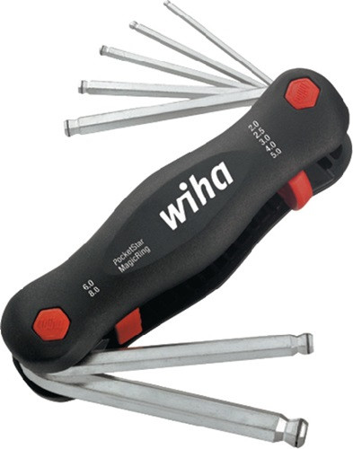 mit Kugelköpfen (ermöglicht das Schrauben bis zu einem Winkel von 25°) und Halteringen für die Schrauben (ab Größe 3 mm) · Klingen Chrom-Vanadium-Stahl · Griff aus glasfaserverstärktem Kunststoff · Schlüsselenden gefast · Lieferung im Handklapphalter mit Aushebetaste für einfaches Auswählen der benötigten Schlüsselgröße Weitere technische Eigenschaften: · Bestückung: SW 2 - 8mm