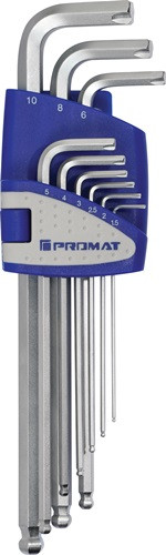 mit Schraublöserprofil zum lösen beschädigter Innensechskantschrauben · mit Kugelköpfen · lang · S2-Stahl · mattverchromt · abgewinkelt · langer Schenkel mit Kugelkopf · ermöglicht das Schrauben bis zu einem Winkel von 25° Weitere technische Eigenschaften: · Bestückung: SW 2 - 8mm
