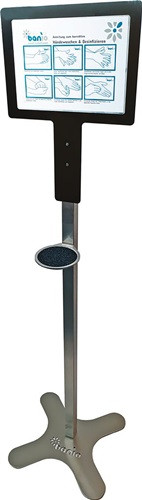 komplett aus Edelstahl mit Desinfektionsanleitung · stabiler Stand · modernes Design · bebilderte Anleitung zum Desinfizieren · für alle herkömmlichen 0,5 l oder 1 l Desinfektionsspender geeignet · Befestigungsmaterial für Spender wird mitgeliefert · nur für Spender 9000 469 212 und 9000 469 213 geeignet