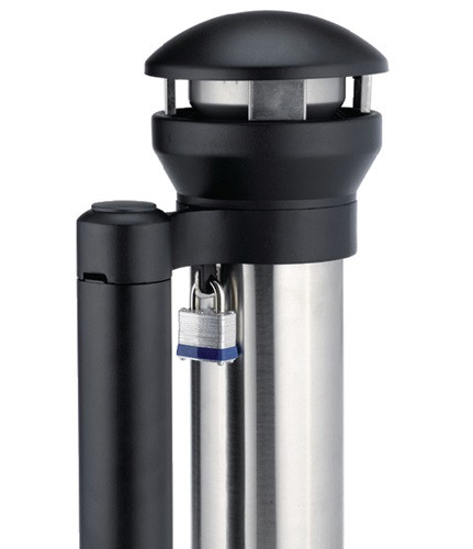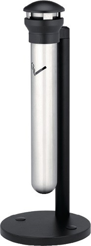 aus Edelstahl · Ständer aus Stahlblech und schwarz beschichtet · wetterfest - geschwungener Verschluss verhindert Eindringen von Regenwasser · Bodenplatte lässt sich am Boden festschrauben · großes Fassungsvermögen, leicht zu entleeren Weitere technische Eigenschaften: · Ausführung: rund