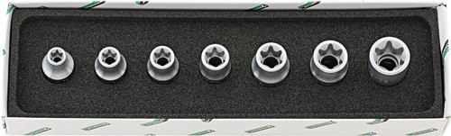 12,5 mm (1/2")-Vierkantantrieb · Inhalt: je 1 Steckschlüssel-Einsatz für Schrauben mit Außen-TORX®-Profil Gr. E 10 / 12 / 14 / 16 / 20 / 24 Weitere technische Eigenschaften: · Inhalt: 7-teilig