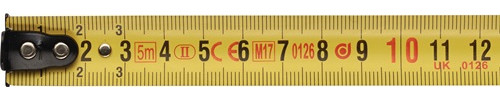 Stahlband mattgelb lackiert · Aufdruck mit beidseitiger Band-Graduierung · eine Seite horizontal, eine Seite vertikal · Selbst-Arretierungs-System (Rücklauf auf Tastendruck) · Länge 5 m und 8 m mit Doppelendhaken · verchromtes Kunststoffgehäuse mit Teil-Gummiüberzug und Gürtelclip · EG-Genauigkeitsklasse II Weitere technische Eigenschaften: · Teilung: mm/cm · Gehäuse: 2K · Genauigkeit: EG II
