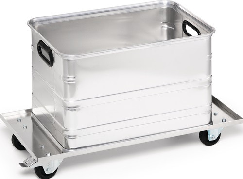 Tragfähigkeit 50 kg · verzinkt · 2 Lenk-und 2 Bockrollen, 1 Lenkrolle mit Feststeller · Gummibereifung, Rad Ø 80 x 25 mm · für Aluminiumboxen 29 l bis 90/91 l und Aluminium Transportbox 28 l bis 80 l
