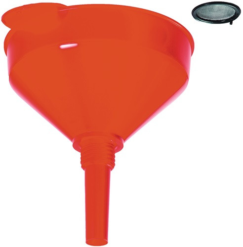 HD-PE · orange · lebensmittelecht (LFGB konform) · herausnehmbares Feinsieb aus Metall · mit Entlüftungsstegen für schnellen Durchlauf · mit stabilem Laschengriff und Aufhängung · bruchfeste, stabile Ausführung · kraftstoff-, öl- und säurebeständig Weitere technische Eigenschaften: · Farbe: orange