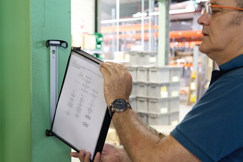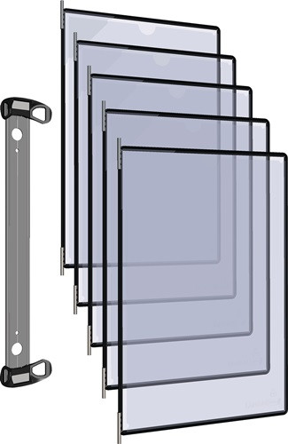 Komplett-Set · mit Aluminiumschiene · mit T-Clip zur Befestigung (ohne Werkzeug) der Aluminiumschiene an allen Aluprofilen mit 8er oder 10er Nut · Befestigung mit Schrauben (nicht im Lieferumfang enthalten) oder Magnetband · schnell einsatzbereit durch Neodym-Magnete, für ein schnelles austauschen der Tafeln · Sichttafeln PP mit kunststoffummanteltem Stahldraht · starke Metalldrehzapfen · mit Easy-Load Öffnungssystem, die fordere Folie wird unter einen Eckverschluss geschoben · für eine Aufnahme von bis zu 20 Blätter · mit 5 Sichttafeln bzw. 10 Sichttafeln schwarz