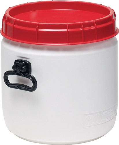 mit großer Einfüllöffnung · mit Schraubverschluss · stabile Kunststoffgebinde ohne Metallbestandteile · stapelbar · UN-X-Zertifizierung für Feststoffe · luft- und wasserdicht · orginalitätssicher zu verplomben, lebensmittelrechtliche Unbedenklichkeit · max. Fülltemperatur bis 70 °C · der Inhalt muss auf 30 °C abgekühlt sein, bevor man das Fass schließen und stapeln kann