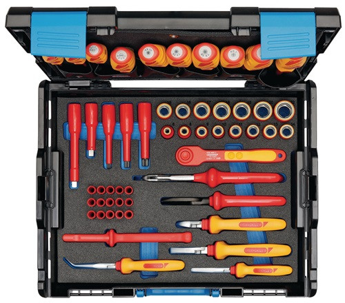 für die Elektroinstallation bestückt mit hochwertigen Werkzeugen in Handwerker- und Industriequalität mit Check-Tool-Einlage für das schnelle Erkennen von fehlendem Werkzeug ideal für Reparatur- und Wartungsarbeiten an Hybrid- und Elektrofahrzeugen Bestehend aus: je 1 Schraubendreher* für Schlitzschrauben 2,5 / 3,5 / 4 / 5,5 mm (VDE 2170) je 1 Schraubendreher* für Schrauben mit Kreuzschlitz (PH ) Gr. 1 / 2 / 3 (VDE 2160) je 1 Schraubendreher* für Schrauben mit Innen-TORX®-Profil T 20 / 25 / 30 (VDE 2163 TX) je 1 6-kant -Steckschlüssel-Einsatz VDE-isoliert 10 mm (3/8”) SW 6 / 8 / 9 / 10 / 11 / 12 / 13 / 14 / 15 / 16 / 17 / 18 / 19 / 20 / 22 mm (VDE 30) je 1 6-kant -Steckschlüssel-Einsatz VDE-isoliert für Schrauben mit Innen-Vielzahn-Profil Gr. M 8 / 10 / 12 (VDE INX 30) je 1 Verlängerung VDE-isoliert 10 mm (3/8”) 75 / 150 mm (VDE 3090) 1 Umschaltknarre VDE-isoliert 10 mm (3/8”) (VDE 3093 U) 1 Kabelschere VDE-isoliert , 200 mm, Arbeitsbereich Kupfer-/Aluminiumkabel bis 20 mm Ø (VDE 8094) 1 Wasserpumpenzange VDE-isoliert , 250 mm 7-fach verstellbar (VDE 146 10) 1 Kraft-Kombizange VDE-isoliert , 200 mm (VDE 8250-200 H) 1 Kraft-Seitenschneider VDE-isoliert , 180 mm (VDE 8314-180 H) 1 Flachrundzange VDE-isoliert , 200 mm (VDE 8132 AB-200) 1 Flachzange VDE-isoliert (VDE 8120-160 H) 1 Kabelmesser* 180 mm (VDE 4522) je 1 Zählertülle zum Isolieren von Einzeladern mit Kennzeichnung 1 / 2 / 3 (V 914) * = VDE isoliert