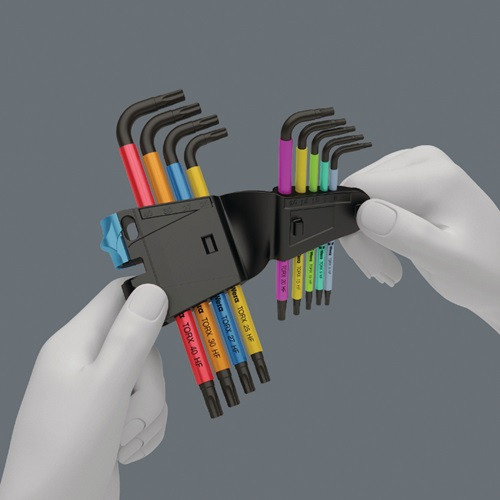 mit Haltefunktion · für Schrauben mit Innen-TORX®-Profil · die Haltefunktion wird durch einen geometrischen Formschluss gewährleistet · ideal für alle schwer zugänglichen Einbauorte Besonderer Produktvorteil: · jeder Schlüssel für schnelles Finden farbcodiert Der mit einem Schiebehalter zu öffnende Winkelschlüsselclip sorgt für dauerhafte Klemmung der Winkelschlüssel und bietet einen schnellen und sicheren Zugriff Weitere technische Eigenschaften: · Bestückung: T8 - T40