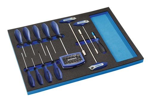 mit 6 auf kugelgelagerten Teleskopschienen herausziehbaren Schubladen mit 100 % Auszug mit jeweils einer Antirutschmatte · automatischer Schubladeneinzug · robuste Ablagefläche aus Polypropylen · Einteilerset für 4 Schubladen im Lieferumfang enthalten · abschließbar mittels eingebautem Zylinderschloss inkl. 2 Schlüsseln · PP Rollen – 2 starre und 2 lenkbare Rollen mit Feststellung · beidseitiges Lochwandsystem (9 x 9 mm) für einfache Installation von Zubehörartikeln Maß über alles aufgebaut mit Griff und Rädern (B x T x H) 755 x 465 x 1030 mm Maß nur Korpus (B x T x H) 678 x 459 x 859 mm Innenmaß Schubladen (B x T x H) 3 x 568 x 398 x 75 mm Innenmaß Schubladen (B x T x H) 3 x 568 x 398 x 154 mm Tragkraft pro Schublade 25 kg / statische Gesamtbelastbarkeit 300 kg · Bestückung Schublade 1 (Modul Nr. 1): Inhalt: mit 6,3 mm (1/4")-Vierkantantrieb 1 Hebelumschaltknarre, Rückschwenkwinkel 18° je 1 6-kant-Steckschlüssel-Einsatz mit PROMAT-ENERGY-Profil SW 5 - 6 - 7 - 8 - 9 - 10 - 11 - 12 - 13 mm je 1 6-kant-Tiefbett-Steckschlüssel-Einsatz mit PROMAT-ENERGY-Profil SW 6 - 7 - 8 - 10 mm je 1 Steckschlüssel-Einsatz für Schrauben mit Innen-TORX®-Profil Gr. T 15 - T 20 - T 25,T 30 je 1 Steckschlüssel-Einsatz für Schrauben mit Außen-TORX®-Profil SW E 4, E 5, E 6, E 8 je 1 Steckschlüssel-Einsatz für Schrauben mit Innen-Sechskant-Profil SW 3,4,5,6 mm je 1 Steckschlüssel-Einsatz für Schlitzschrauben 0,8 x 4,0 mm und 1,0 x 5,5 mm je 1 Steckschlüssel-Einsatz für Schrauben mit Kreuzschlitz (PH) Gr. 1, 2 je 1 Steckschlüssel-Einsatz für Schrauben mit Kreuzschlitz (PZD) Gr. 1, 2 je 1 Verlängerung 75 mm und 150 mm 1 Gleitstück für Verlängerung 1 Kardangelenk 1 Handgriff mit Vierkant Inhalt: mit 12,5mm (1/2")-Vierkantantrieb 1 Hebelumschaltknarre, Rückschwenkwinkel 10° je 1 6-kant-Steckschlüssel-Einsatz mit PROMAT-ENERGY-Profil SW 10 - 11 - 12 - 13 - 14 - 15 - 16 - 17 - 19 - 22 - 24 - 27 - 30 - 32 mm je 1 6-kant-Tiefbett-Steckschlüssel-Einsatz mit PROMAT-ENERGY-Profil SW 13-17-19 mm je 1 Steckschlüssel-Einsatz für Zündkerzen SW 16 und 21 mm je 1 Steckschlüssel-Einsatz für Schrauben mit Außen-TORX®-Profil SW E 10, E 12, E 14, E 18 je 1 Steckschlüssel-Einsatz für Schrauben mit Innen-Sechskant-Profil Länge 100 mm, SW 7, 8, 10 je 1 Steckschlüssel-Einsatz für Schrauben mit Innen-TORX®-Profil Gr. T 40, T 45, T 50, T 55 je 1 Verlängerung 125 mm und 250 mm 1 Gleitstück für Verlängerung 1 Kardangelenk Bestückung Schublade 2 (Modul Nr. 3): Inhalt: 1 Schraubendreher für Schlitzschrauben Gr. 3,5 x 100 mm 1 Schraubendreher für Schrauben mit Kreuzschlitz (PH) PH0 x 60 mm 2 Schraubendreher für Schrauben mit Kreuzschlitz (PZD) Gr. 1 x 80 mm und 2 x 100 mm 5 Schraubendreher für Schrauben mit Innen-TORX®-Profil 1 Bit-/Steckschlüsselset 6-kant, 24-teilig, für Schlitzschrauben, für Schrauben mit Kreuzschlitz (PH + PZD), Schrauben mit Innensechskant-Profil, Schrauben mit Innen-TORX®-Profil 3 Schraubendreher für Außen-Sechskantschrauben Gr. 8 x 200, 10 x 200 und 13 x 230 mm 1 Bithalter mit Handgriff (6,3 mm)1/4 Zoll Bestückung Schublade 3 (Modul Nr. 2): 1 Ring-Maul-Schlüssel-Satz 12-teilig (6 - 22 mm) 1 Wasserpumpenzange 240 mm / 1 Kombizange 180 mm / 1 Seitenschneider 160 mm 1 Schlosserhammer 300 g mit Hickorystiel Stiel 1 Cuttermesser 1 Taschenrollbandmaß 5 m 1 Teleskopmagnetheber mit Düseneinstellnadel 150 - 670 mm 1 Körner 120 mm 1 LED- Stableuchte 9,8 cm 1 Winkelschraubendreher-Satz für Schrauben mit Innen-TORX®-Profil, 8-teilig (Gr. 9 - 40) 1 Winkelschraubendreher-Satz für Schrauben mit Innensechskant-Profil, 9-teilig (Gr. 1,5 - 10 mm) 2 Schraubendreher für Schlitzschrauben (5,5 x 125 mm, 6,5 x 150 mm) 2 Schraubendreher für Schrauben mit Kreuzschlitz (PH) (Gr. 1 x 80 mm, 2 x 100 mm) 1 Schraubendreher für Schrauben mit Kreuzschlitz (PH) (Gr. 2 x 25 mm) 1 Schraubendreher für Schrauben m